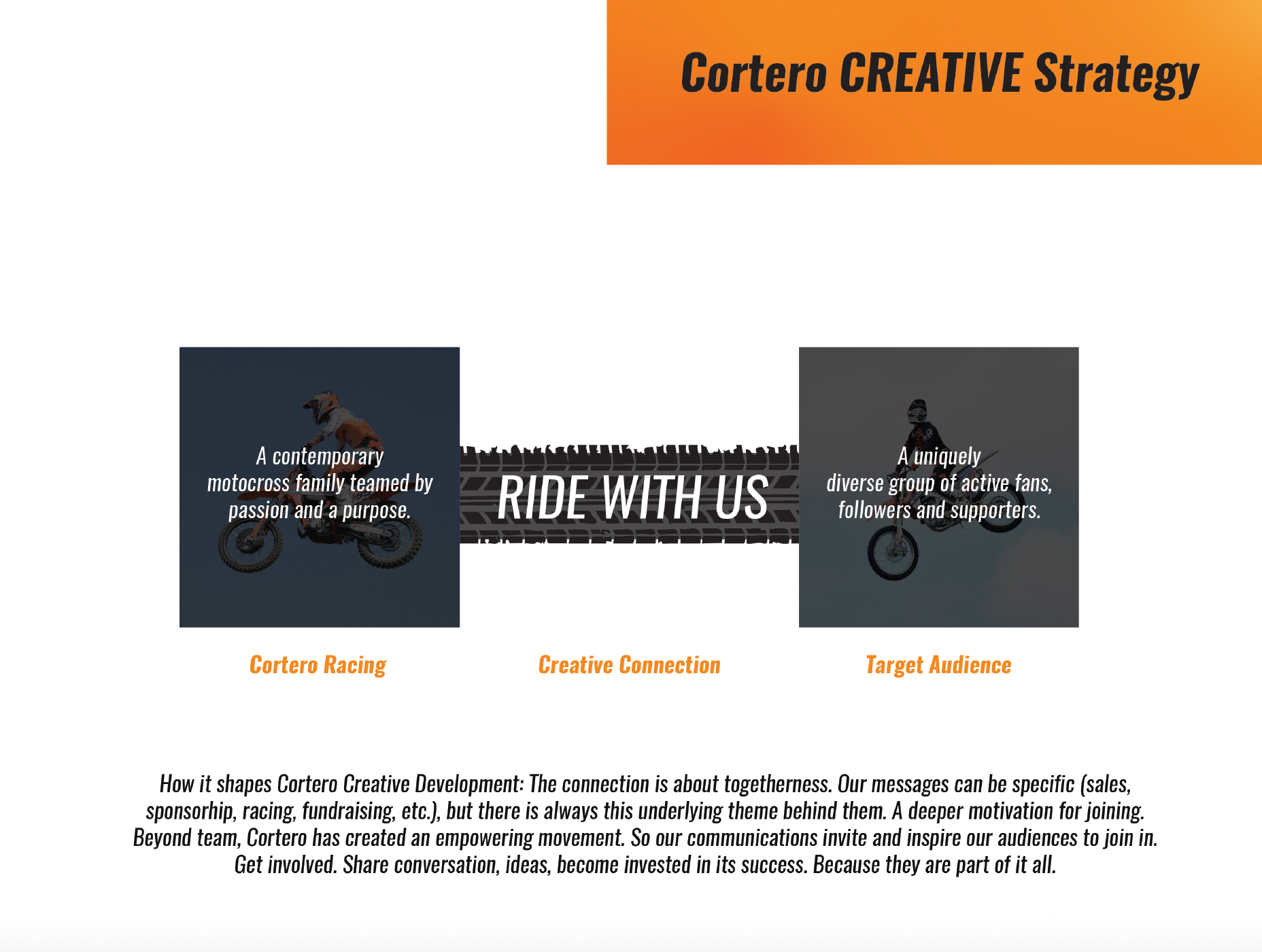 For Cortero Racing, it was about building a brand from the ground up. Starting with the development of the brand's marketing structure to establishing creative strategies and messaging platforms. The work allowed the brand and it's small marketing team to focus on the work at hand, while looking to Cortero's future voice.